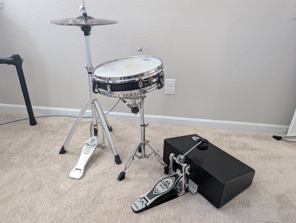 Oh, and I also got a Meinl Bass Box. It sounds great! It’s not too loud for the indoor open mic, and will also help with portability. I also ordered some El Cheapo brand LV hi-hats from a major online retaiIer. And I’ll mute the snare with layers of fabric. So I present to you, my low volume portable drum it…
