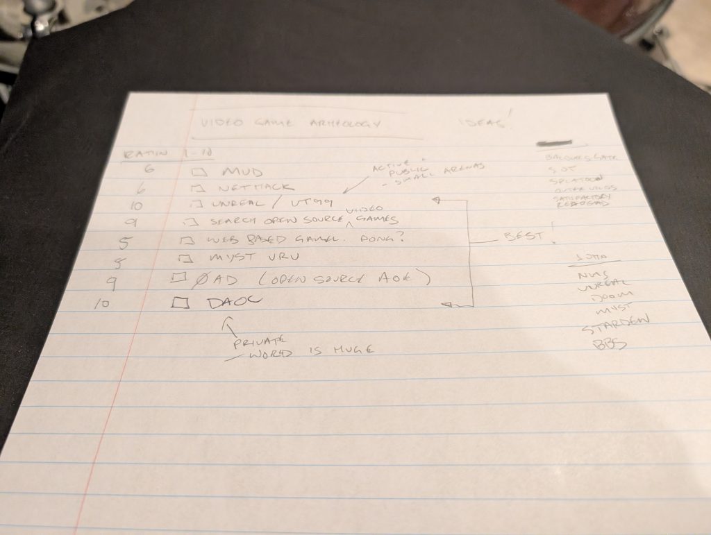 So, I pulled out a pencil and paper and we just started brainstorming and jotting our thoughts down. Games we like. Genres we like. Text based games vs FPS vs RTS.