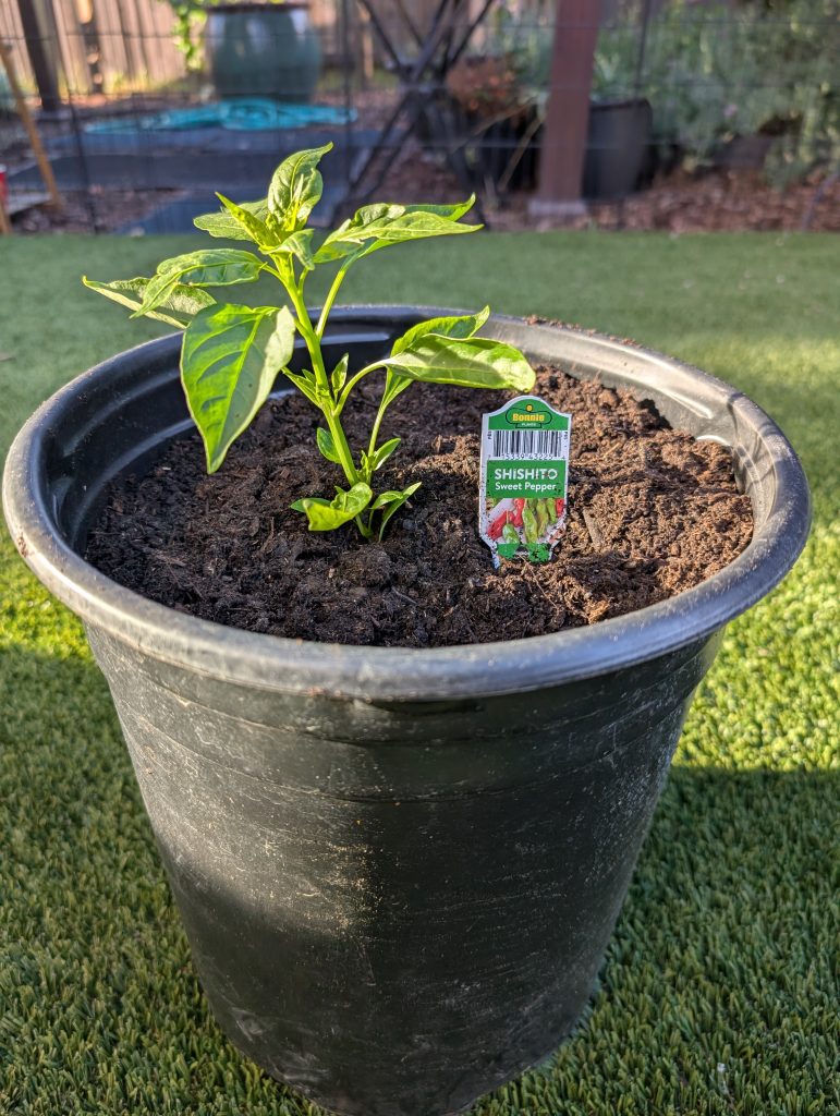 I finally found a Shishito pepper plant! I’ve been looking for quite a while. It wasn’t until a happened upon a little known boutique nursery called Lowe’s. I walked in and saw it sitting right there on the shelf like it’s just supposed to be there no big deal and all.